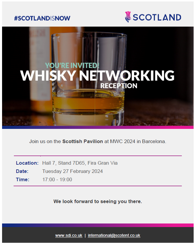 P.S. I'm also attending the Scottish Pavillion Whisky Networking Reception on Tuesday 27th February, Hall 7, Stand 7D65, Fira Gran Via, from 17:00 to 19:00 - if you're free, do join me there.