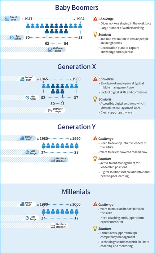 Organisations across all sectors are experiencing a wide-range of workforce demographic challenges. As well as trying to manage the varying expectations of workers from different demographics, they need to make the best use of existing talent and skills, whilst also preparing for the future.